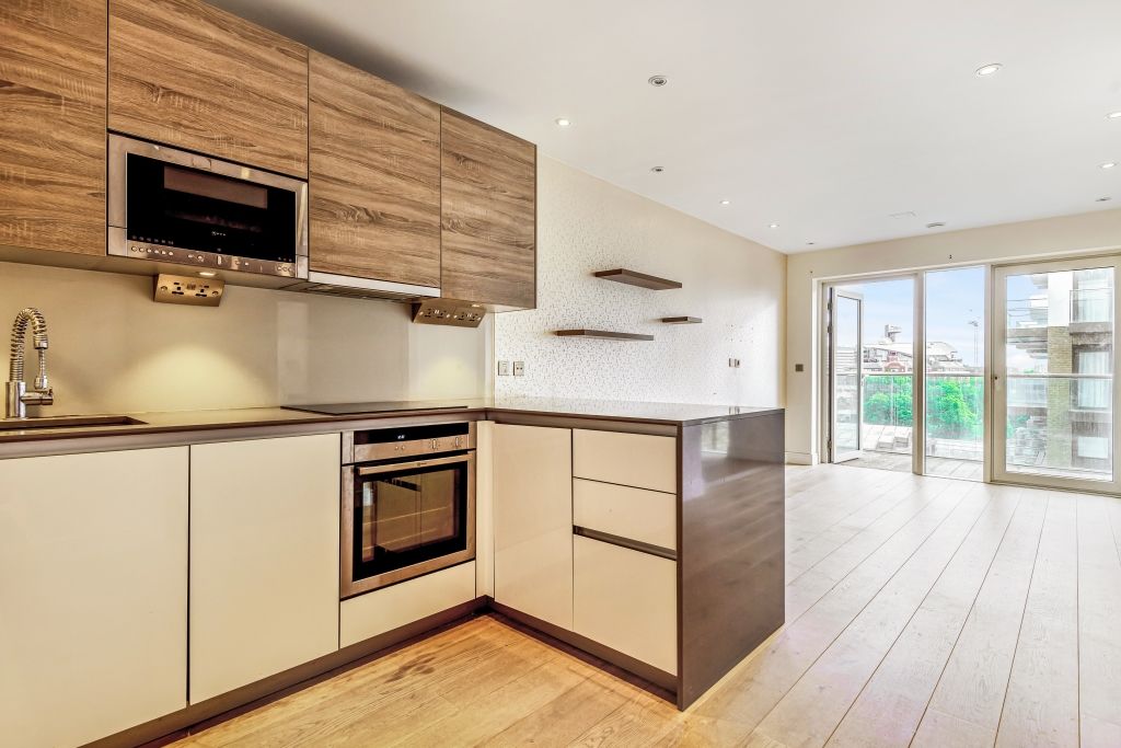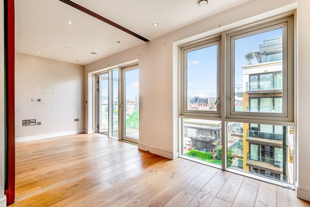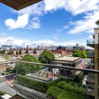 This 5th floor flat has lots of light and a private balcony with views across Hammersmith. It is finished to a high standard, and comprises a double bedroom area, modern bathroom, fully fitted kitchen and a living/dining area. It also comes with wooden floors and a large built-in wardrobe.