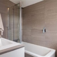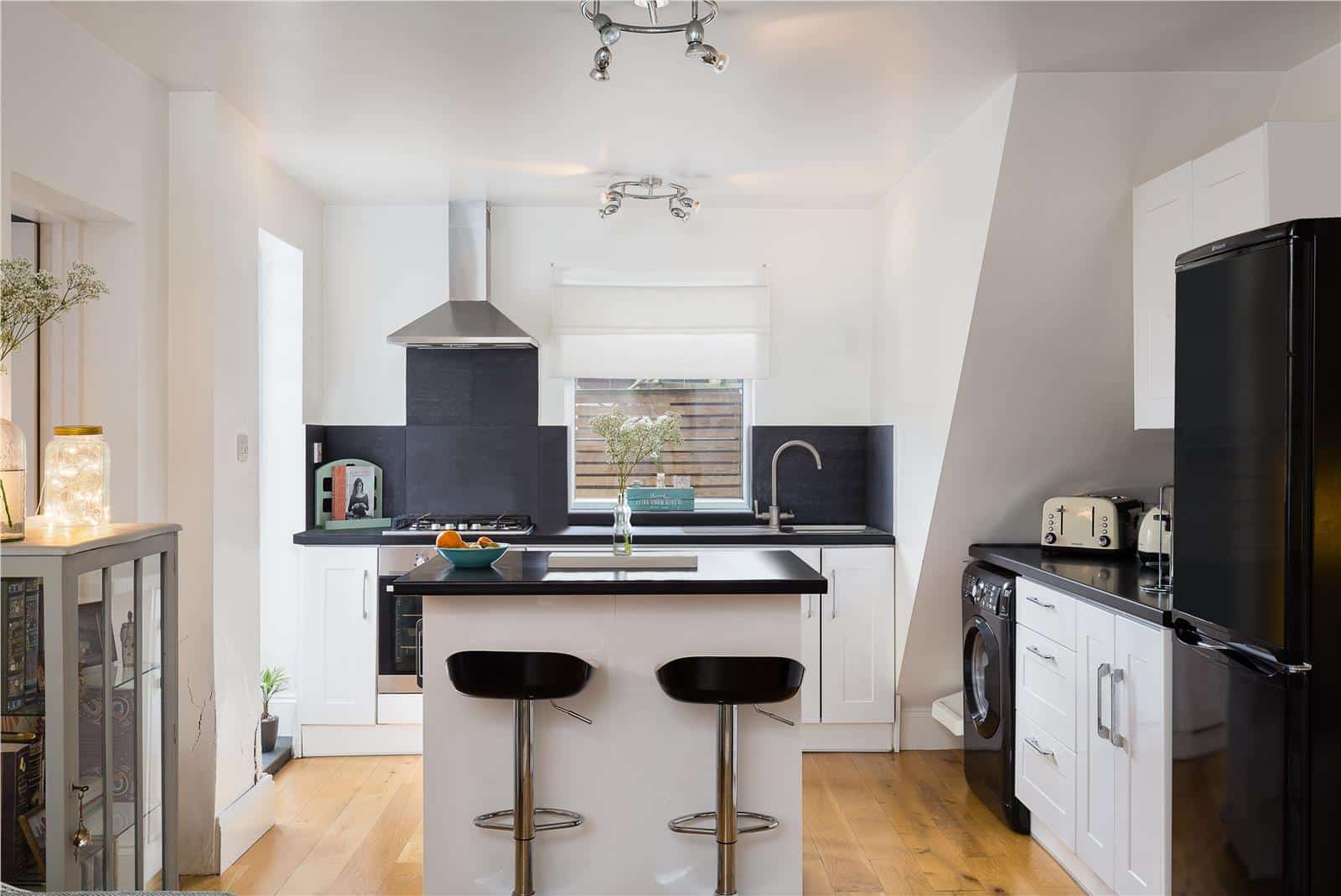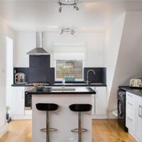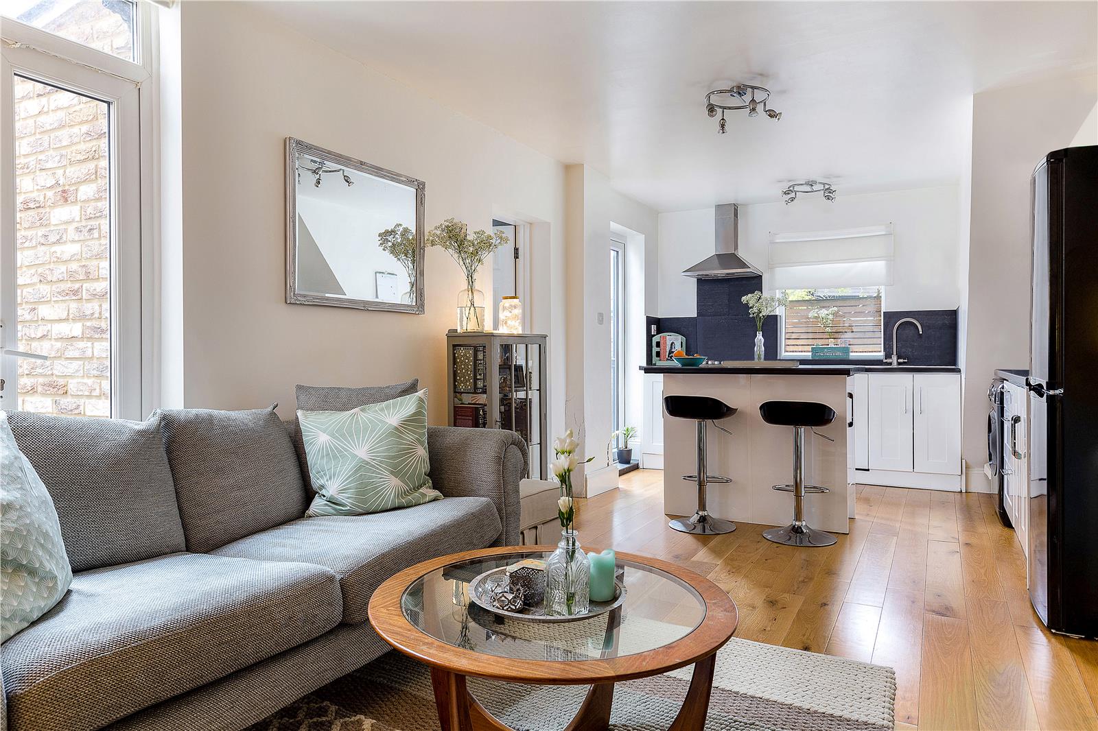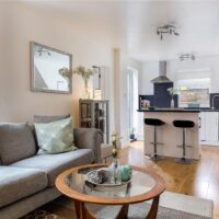 It has a bright open plan living area which includes a fully-equipped kitchen with integrated appliances including a dishwasher. There are also two double bedrooms with plenty of light and good storage space, including some additional storage under the stairs, and a modern bathroom with rainfall shower over the bath.