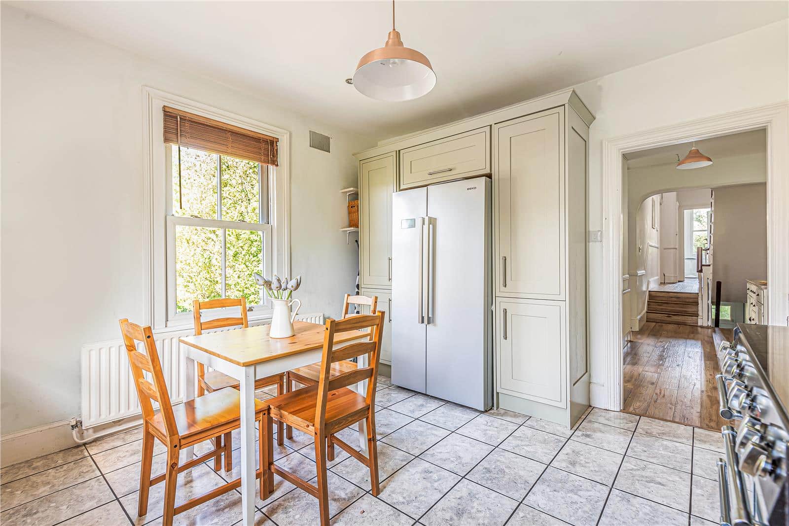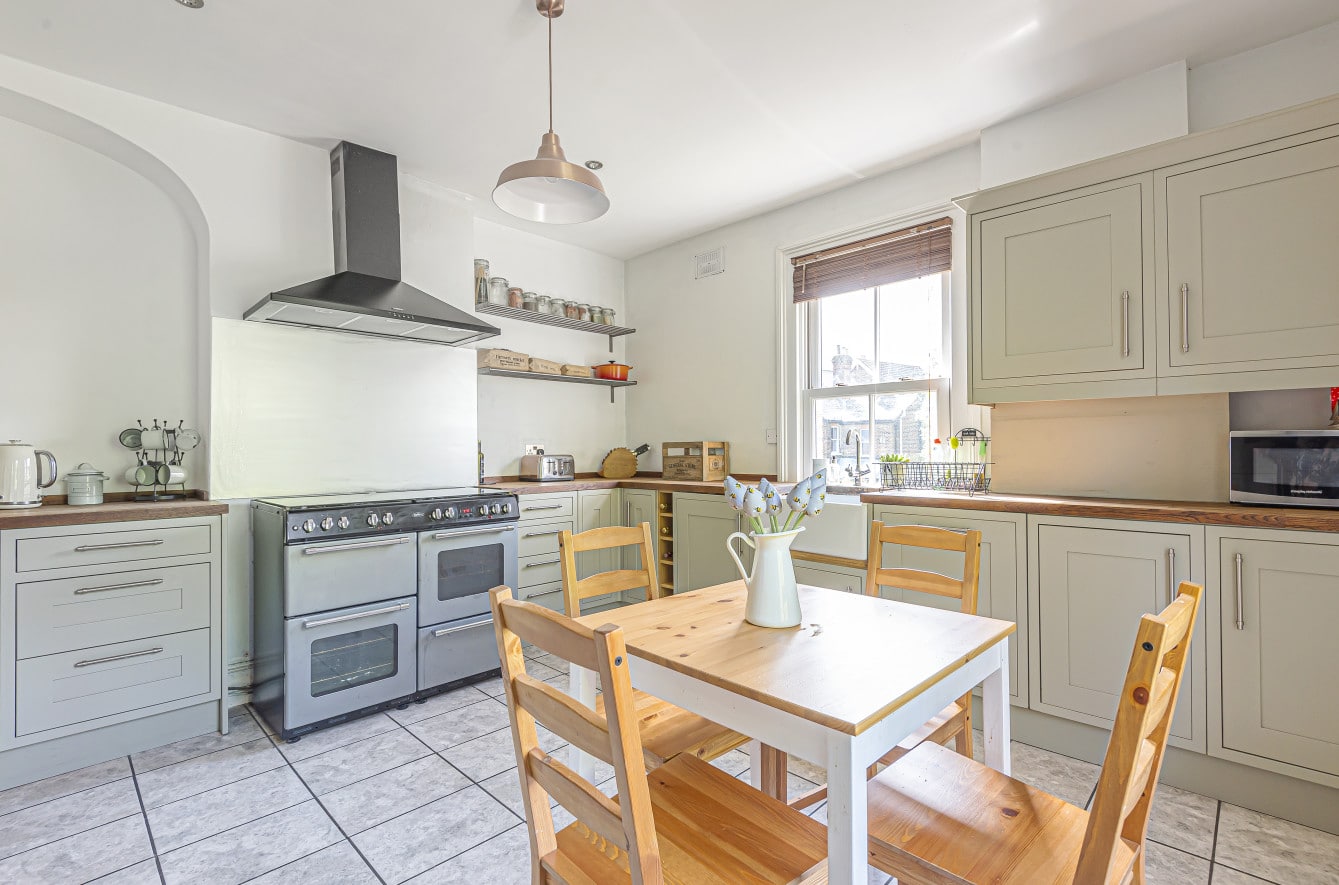 As you enter you have access to the private garden and private entrance on the ground floor, with stairs leading up to the first floor. Here you will find a sizable eat-in kitchen with a range cooker plus American style fridge-freezer and plenty of space for a table and chairs.