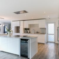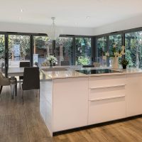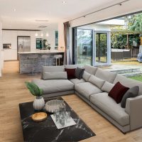 The kitchen opens into a spacious living area with bi-fold doors leading directly to the private garden area. The open-plan living areas are perfect for entertaining, and all living spaces have underfloor heating.