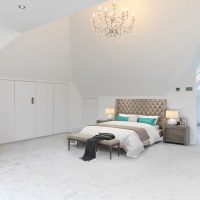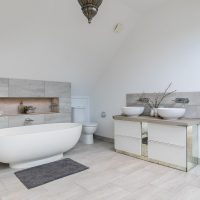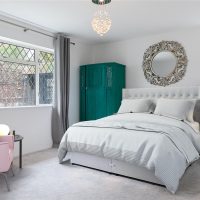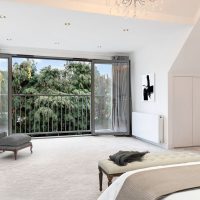 Upstairs is the spacious master bedroom with en-suite, with glass doors overlooking the garden and a fair bit of built-in storage. The en-suite bathroom has a large walk-in shower plus an oval freestanding bath and two basins.