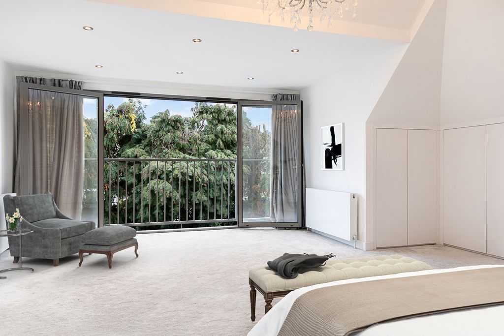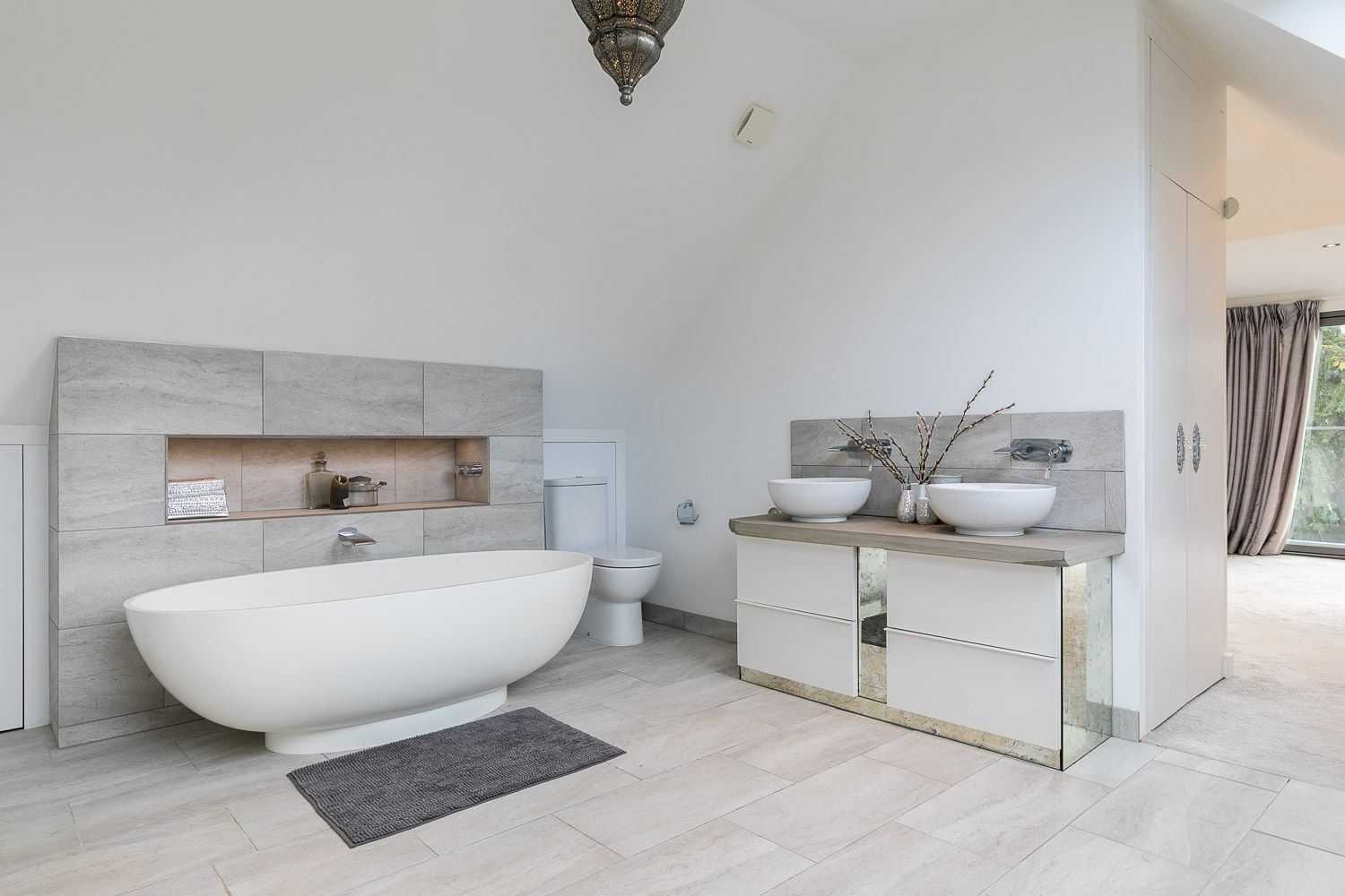 Upstairs is the spacious master bedroom with en-suite, with glass doors overlooking the garden and a fair bit of built-in storage. The en-suite bathroom has a large walk-in shower plus an oval freestanding bath and two basins.