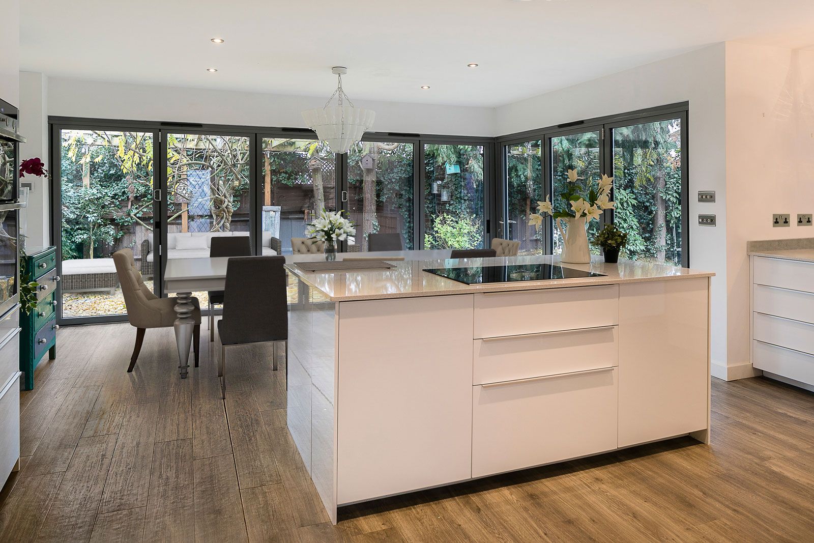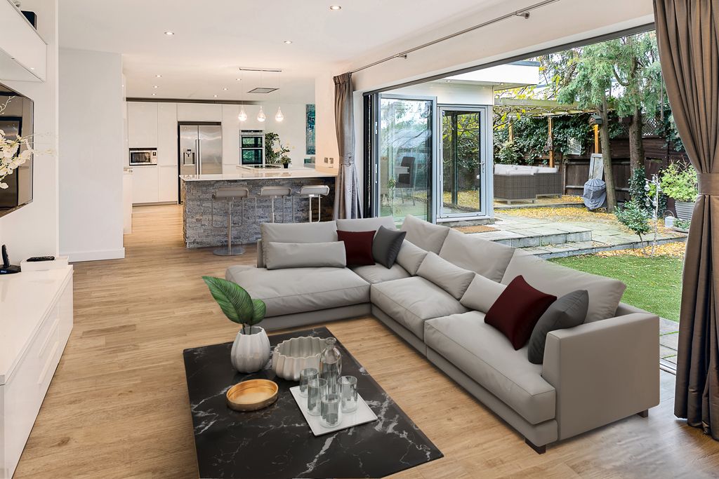 The kitchen opens into a spacious living area with bi-fold doors leading directly to the private garden area. The open-plan living areas are perfect for entertaining, and all living spaces have underfloor heating.