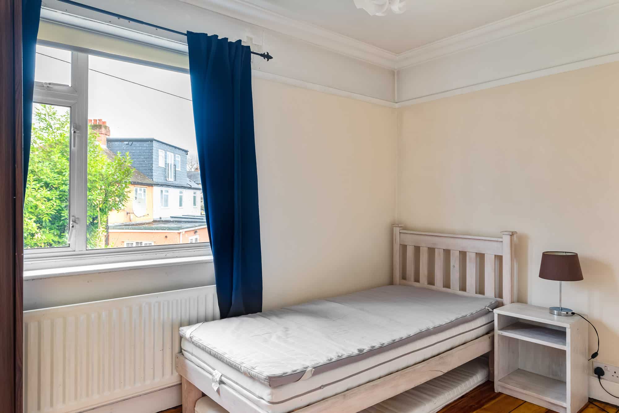 Bedroom 1: single bed, lamp, side-table and wardrobe