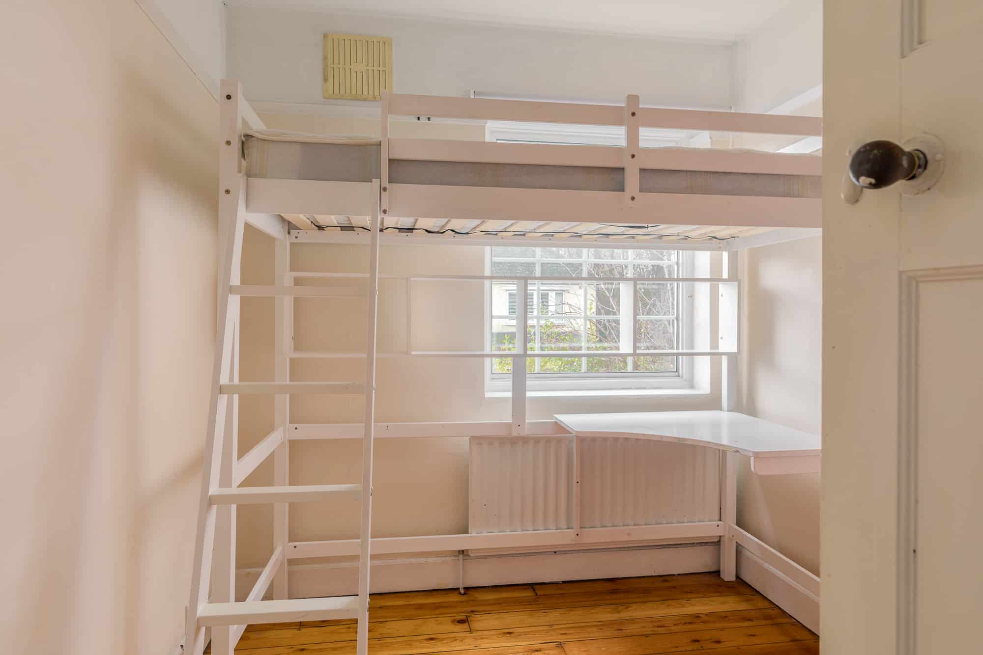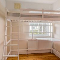 Bedroom 3: Raised single bed with desk underneath, freestanding wardrobe